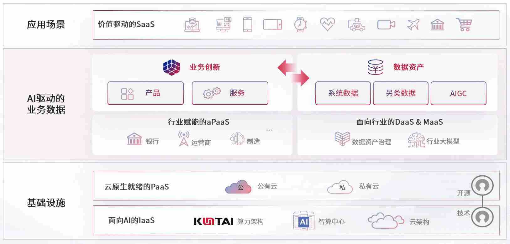 数字时代,,,围绕企业数字化转型的关键要素,,GGPOKER数码开创性的提出数云融合战略和技术体系框架,,,,着力在云原生、、、数字原生、、AI原生和信创产业上架构产品和服务能力,,,为处在不同数字化转型阶段的快消零售、、、、汽车、、、、金融、、医疗、、、政企、、、、教育、、运营商等行业客户提供泛在的敏捷IT能力和融合的数据驱动能力,,构建跨界融合创新的数字业务场景和新业务模式,,,助力企业级客户建立面向未来的核心能力和竞争优势,,全面推动社会的数字化、、智能化转型升级。。